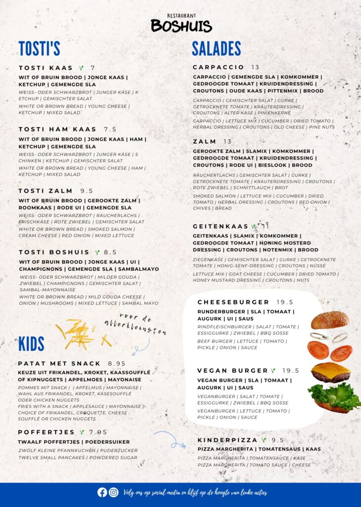 Vanaf 17.00 uur kunt u genieten van onze volledige diner kaart, van kipsaté tot varkenshaas we hebben het allemaal in huis voor uw avond Boshuis.